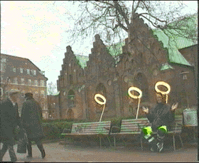 "Lys over ledighed" Lysrörsglorior på rostfria hållare fastskruvade i parkbänkar utanför Vor Frue Kirke "Art Crash" Århus Danmark -99 |